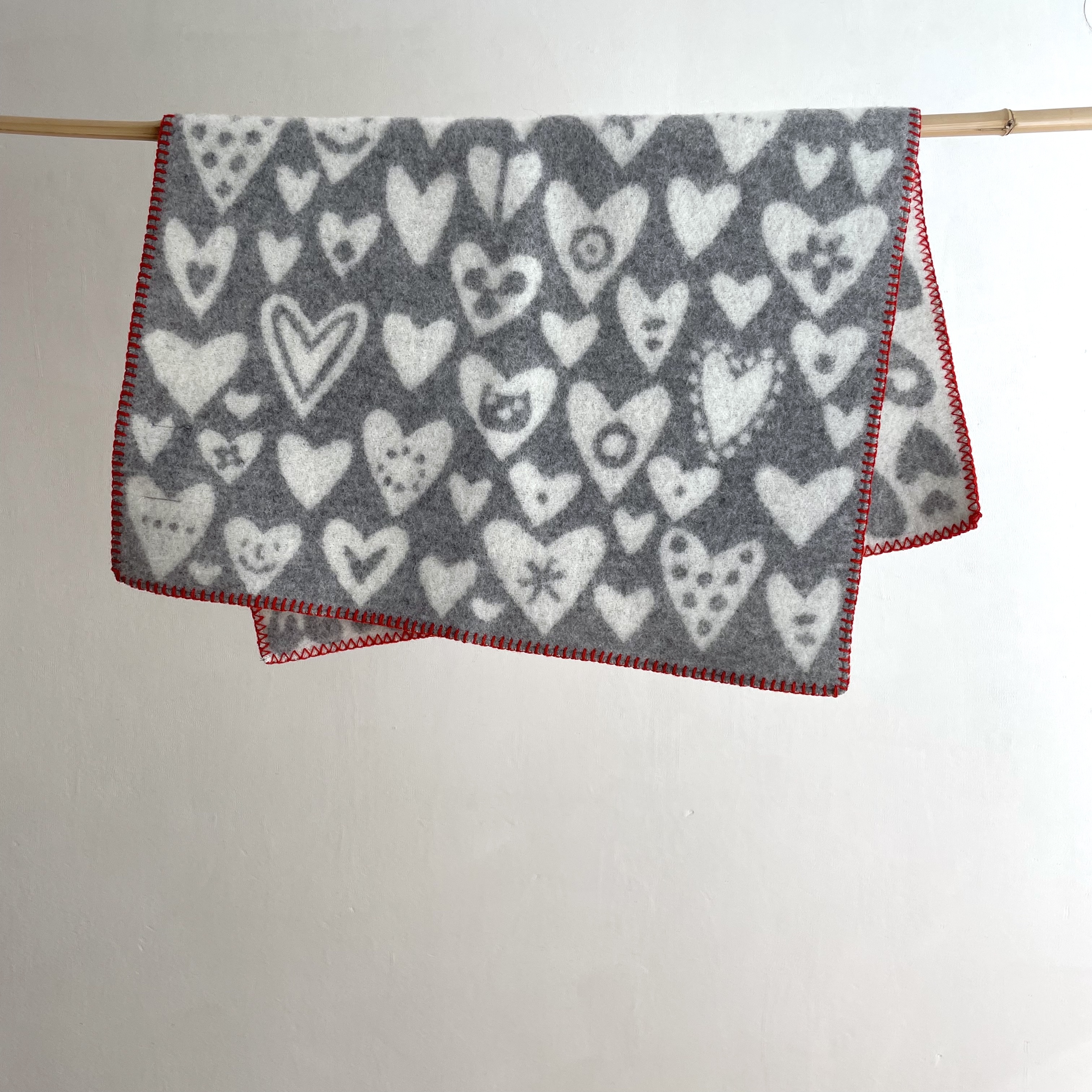 Grau und Wollweiß, rot gekettelt, fröhlich geschmückte Herzen