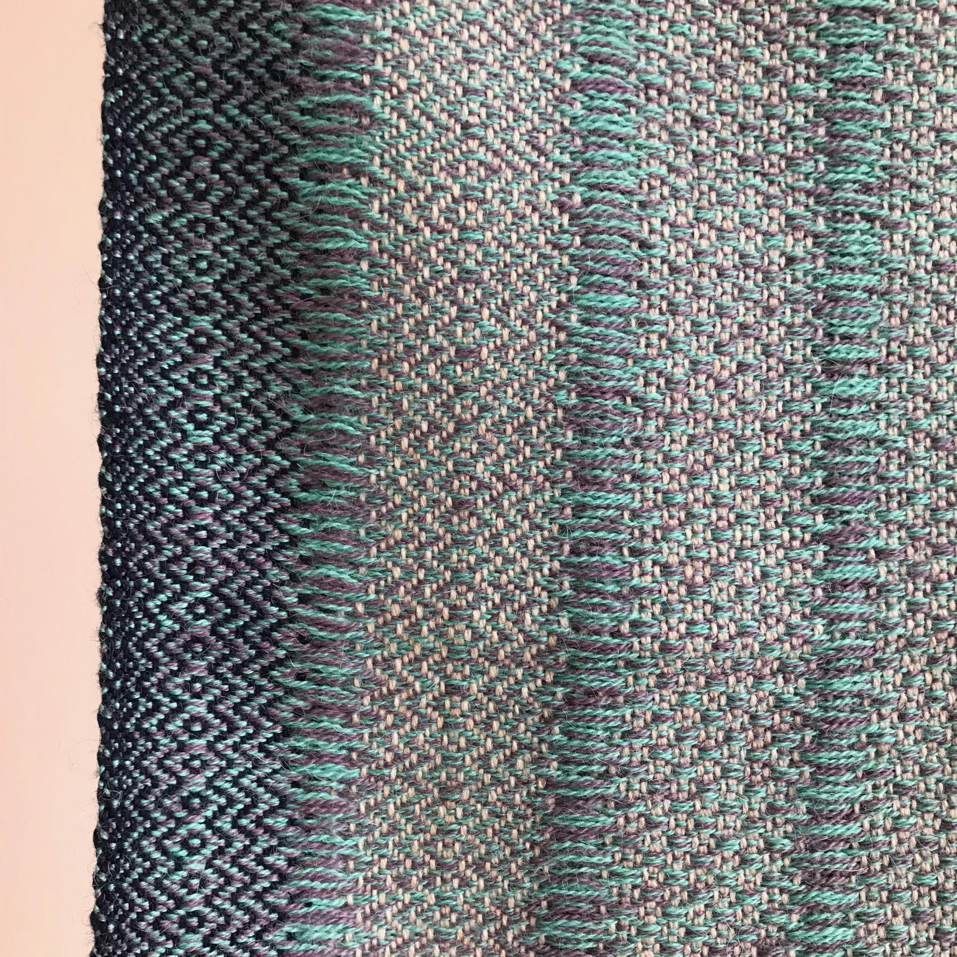 leuchtendes Türkis und Lavendel, Wollweiß, etwas Dunkelgrün und Dunkelblau