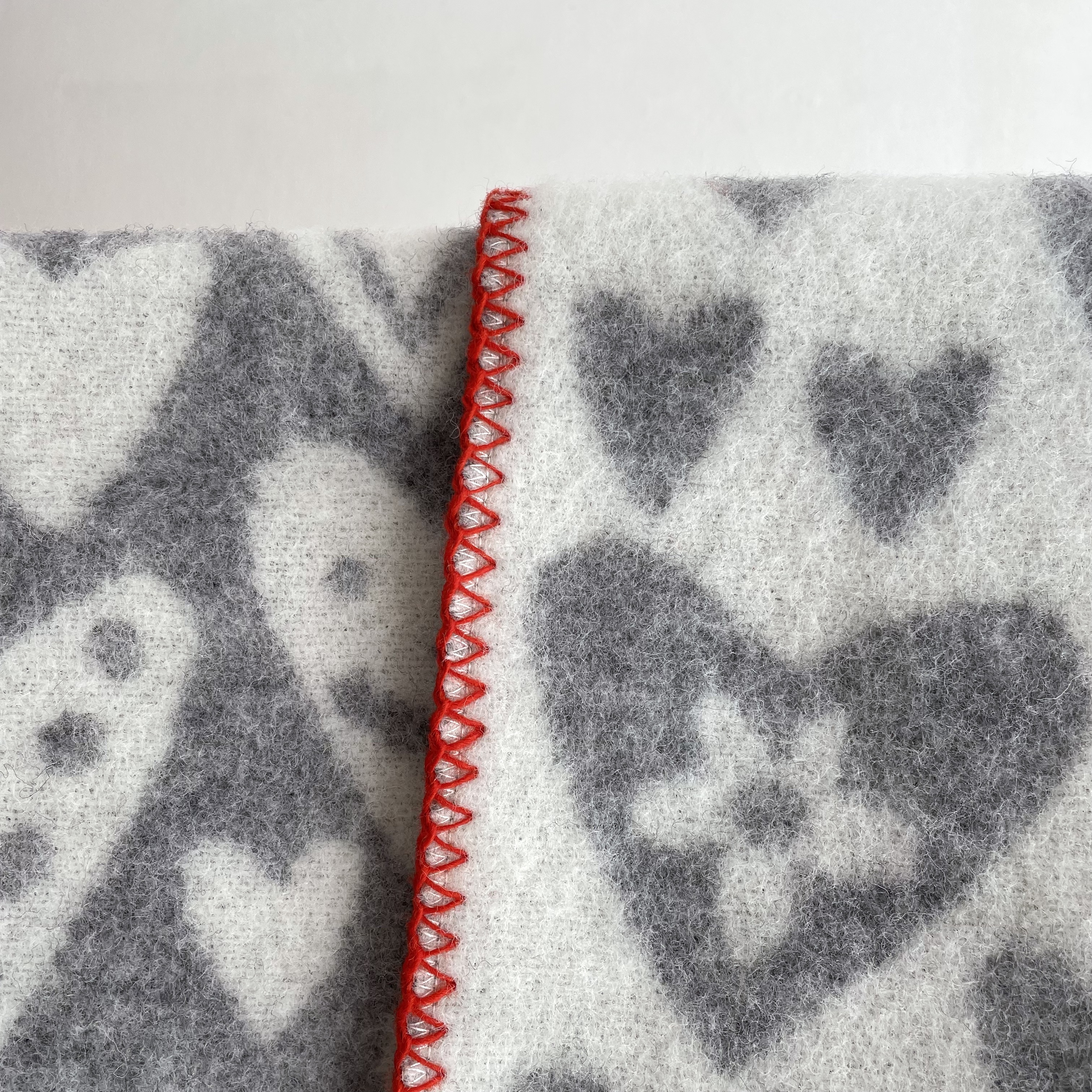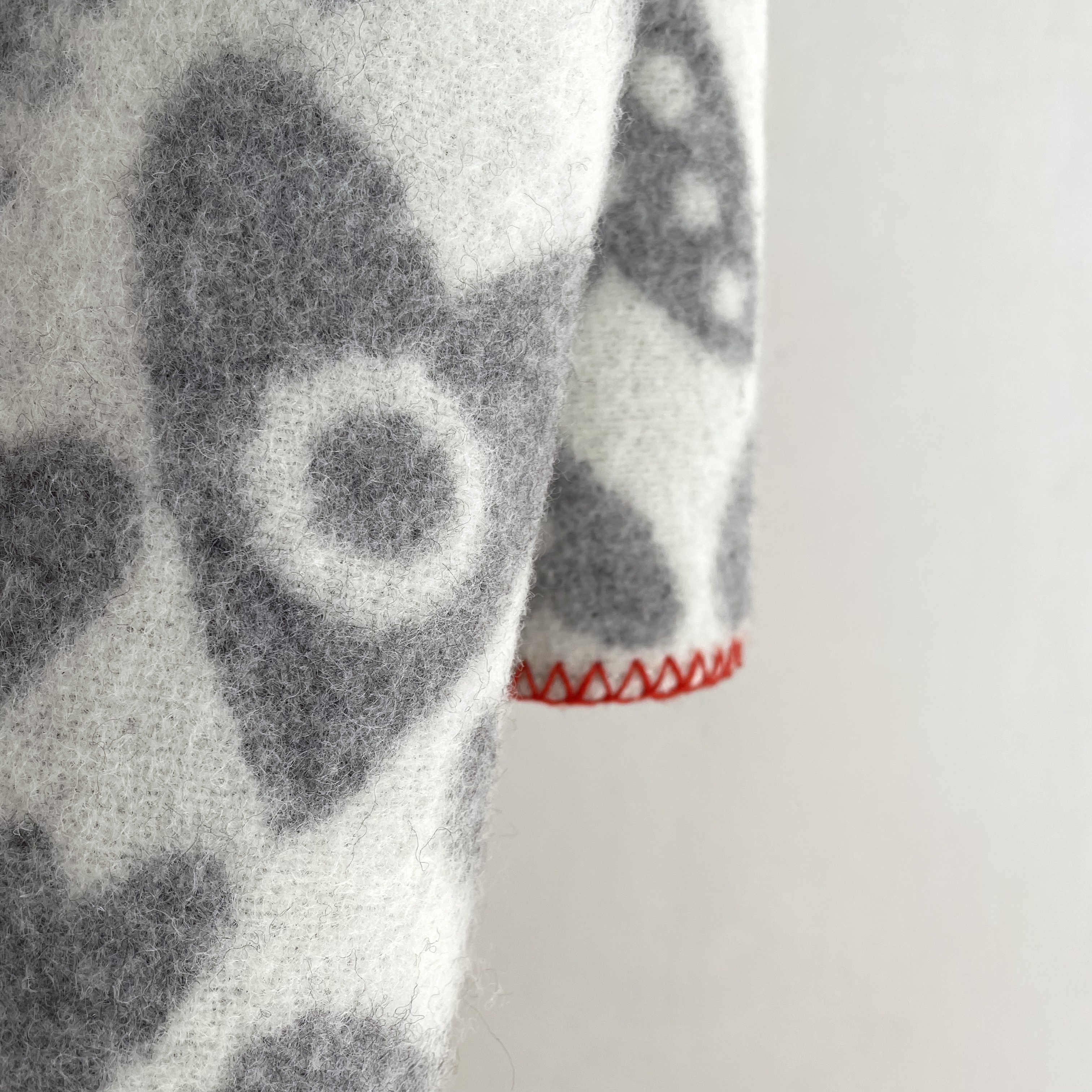 Grau und Wollweiß, rot gekettelt, fröhlich geschmückte Herzen