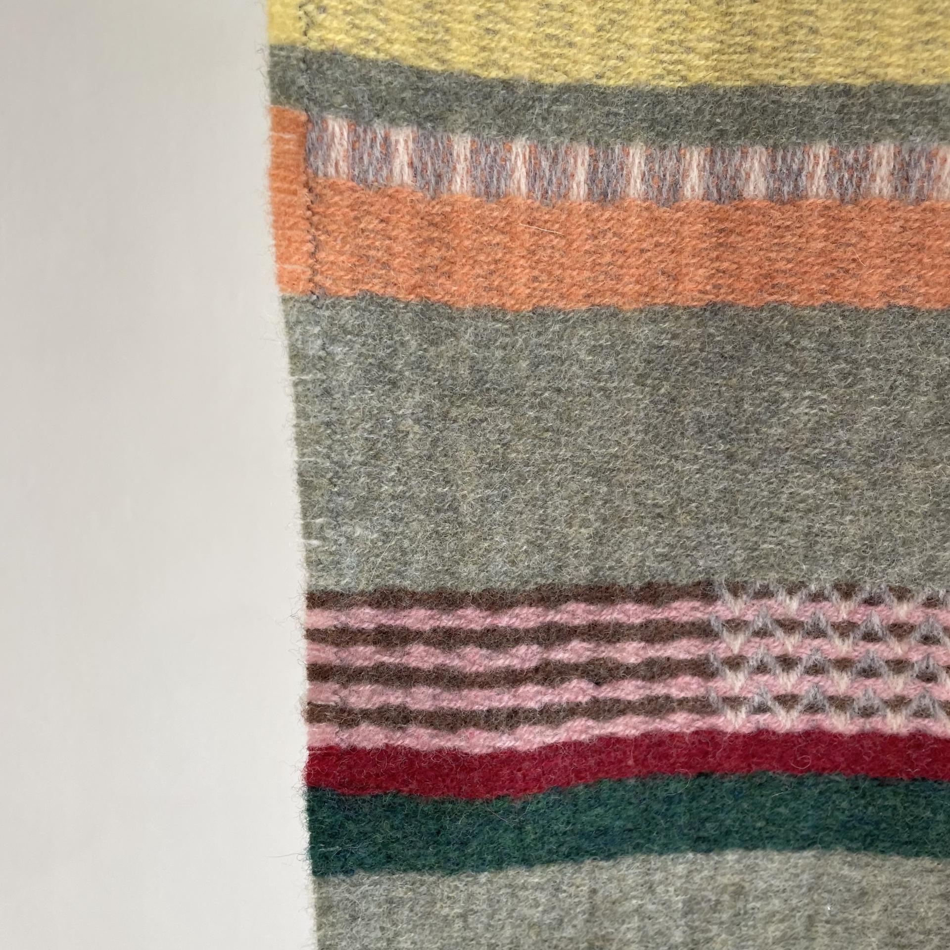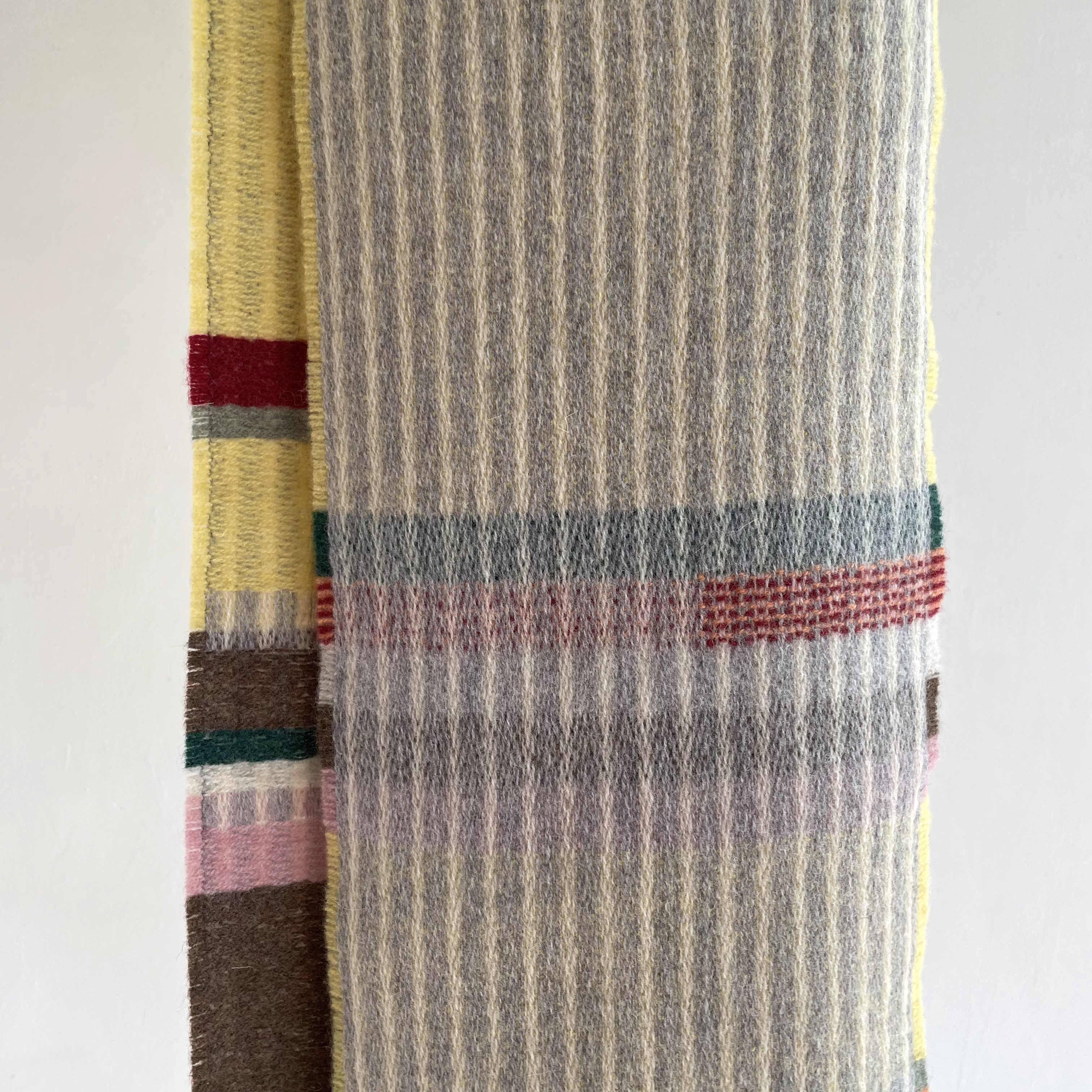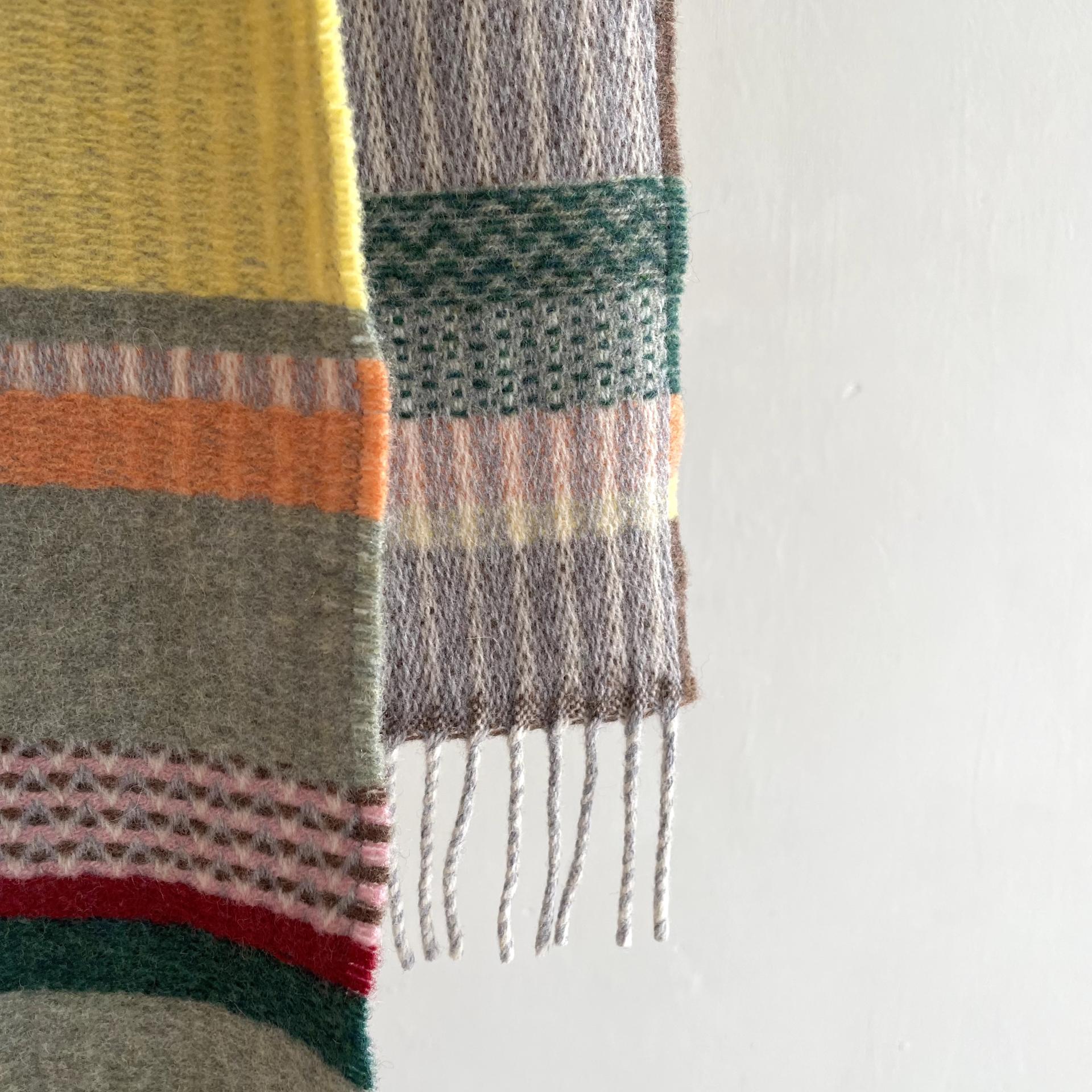 Diese auffälligen, doppelseitigen Schals mischen flache Farbstreifen mit Köperpartien, um ein Strukturrelief zu erzeugen. Sie sind aus superweicher Merino-Lammwolle gefertigt und haben eine wunderbar glatte und kuschelige Oberfläche.