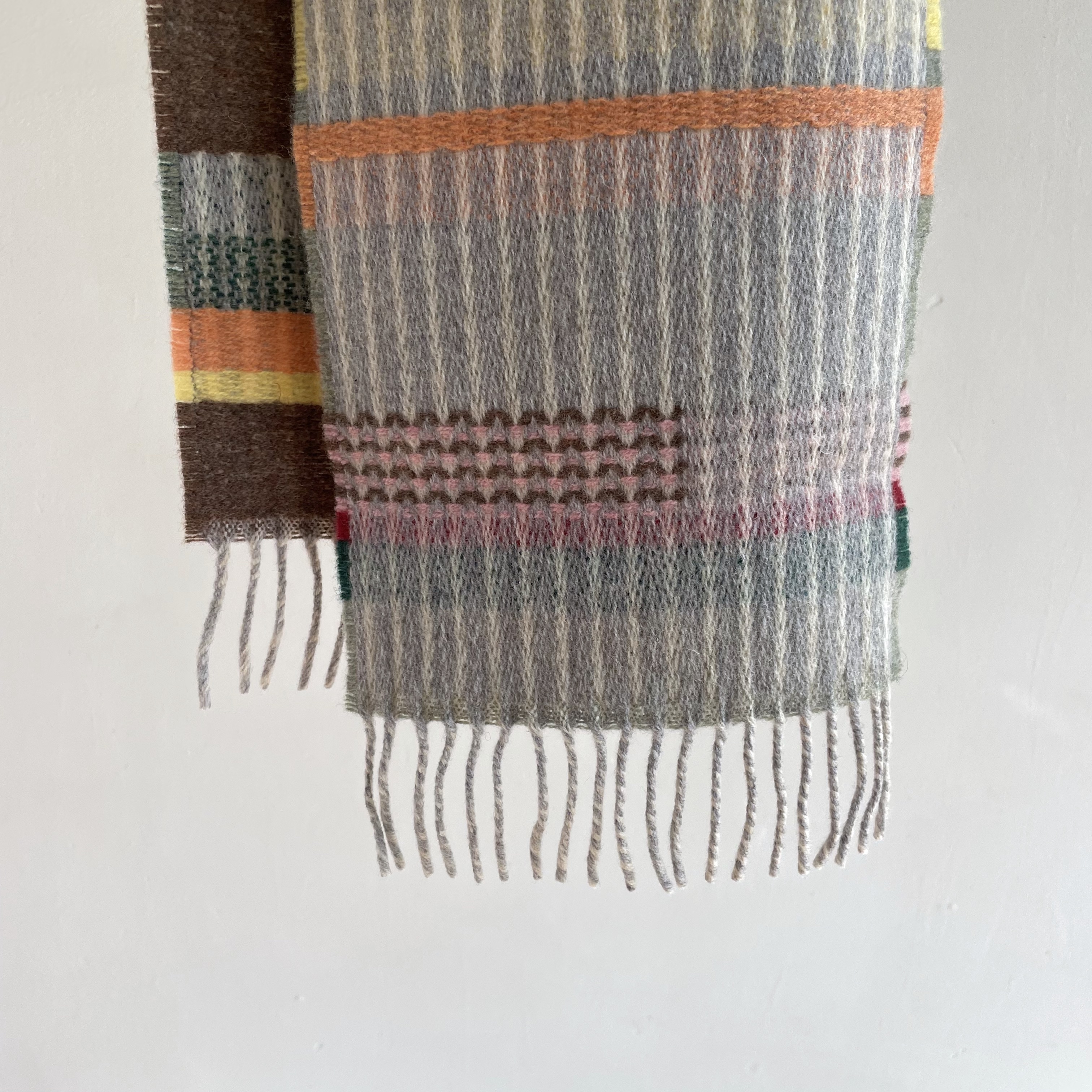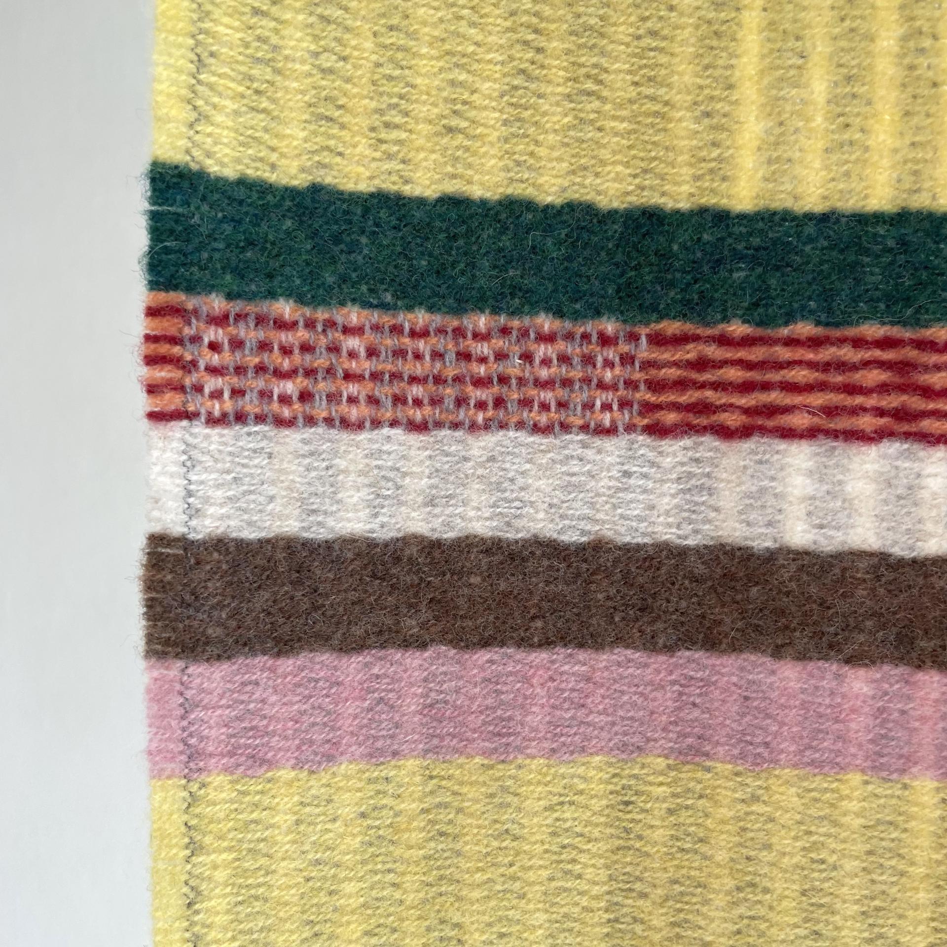 Ocker-, Gelb- und Brauntöne mit Spritzern von Rosa und Obstgartengrün vereinen sich in diesem weichen, gestreiften Schal aus Lammwolle.