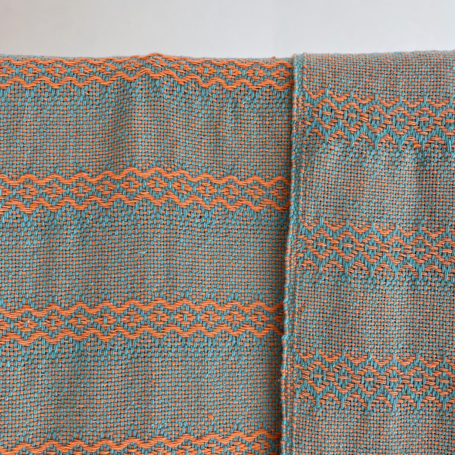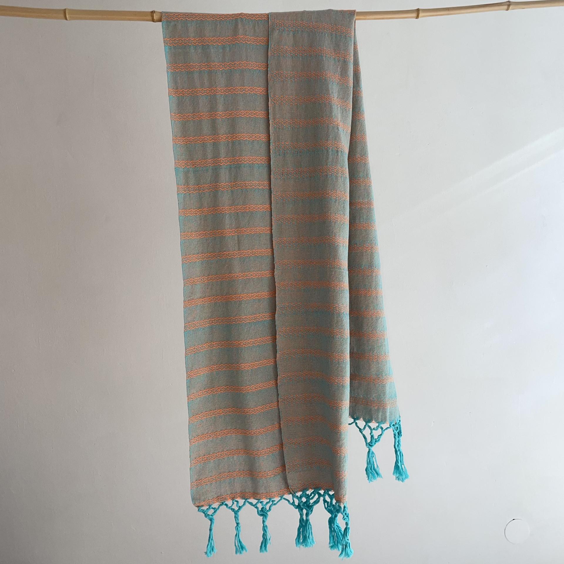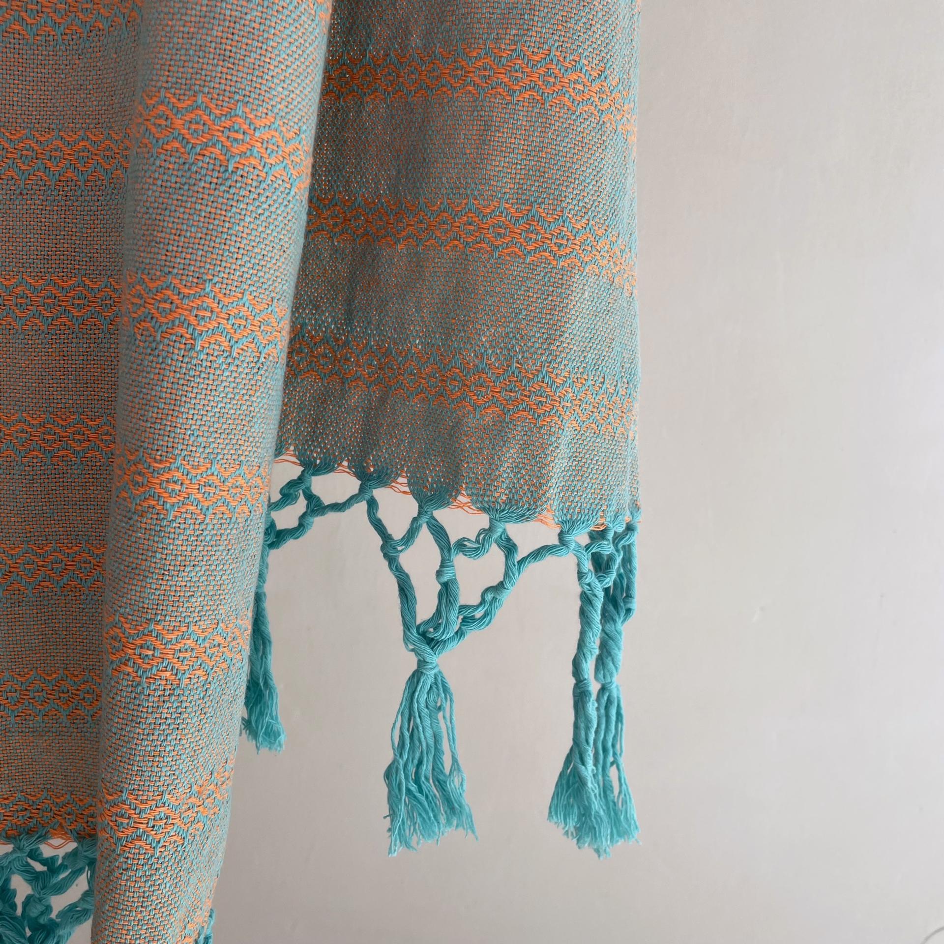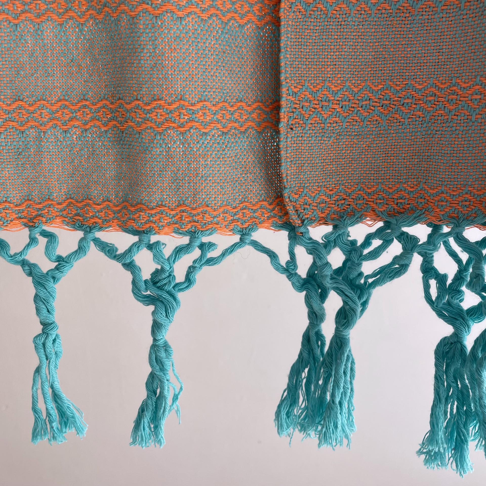 HANDWOVEN COTTON SHAWL FROM MEXICO, TURQUOISE & ORANGE