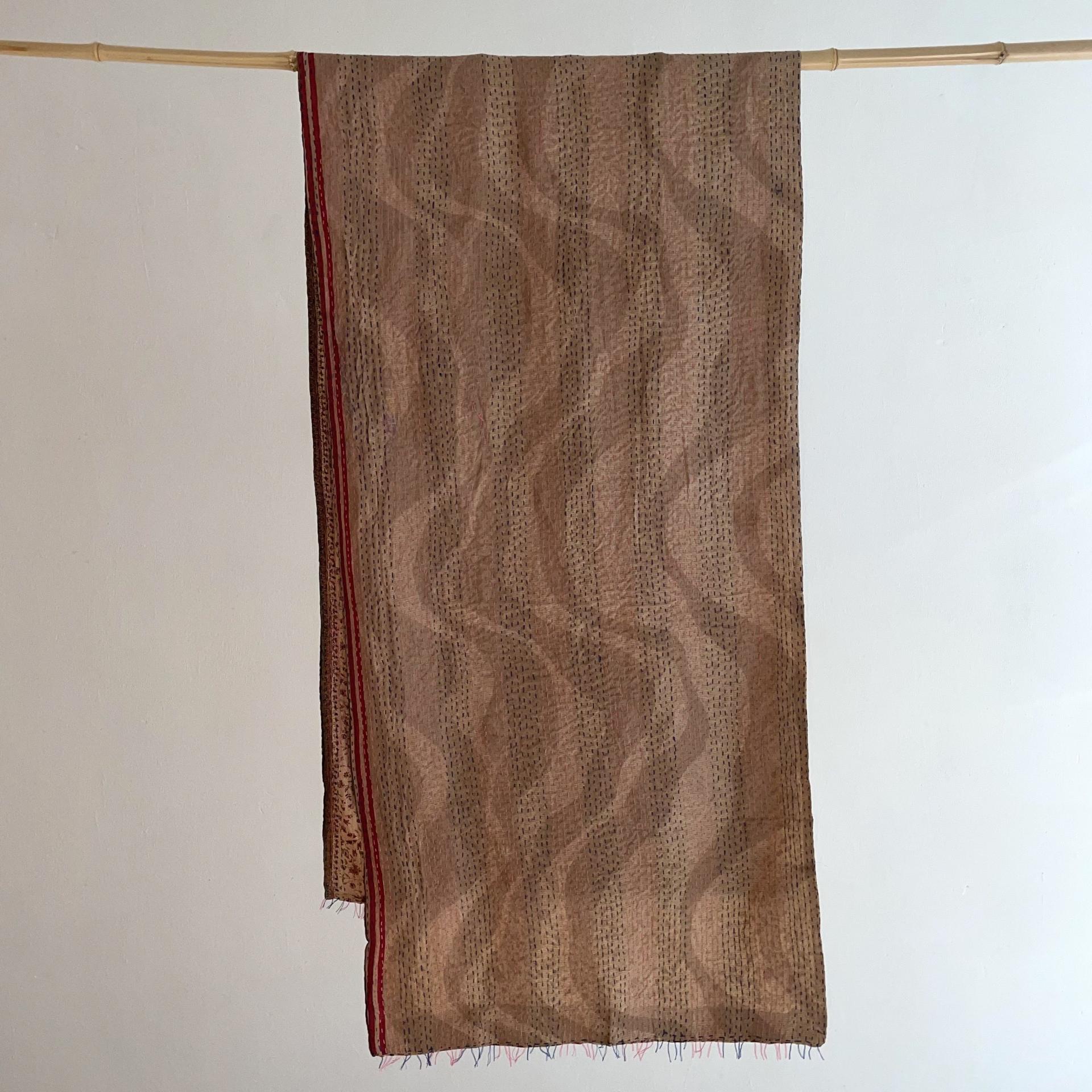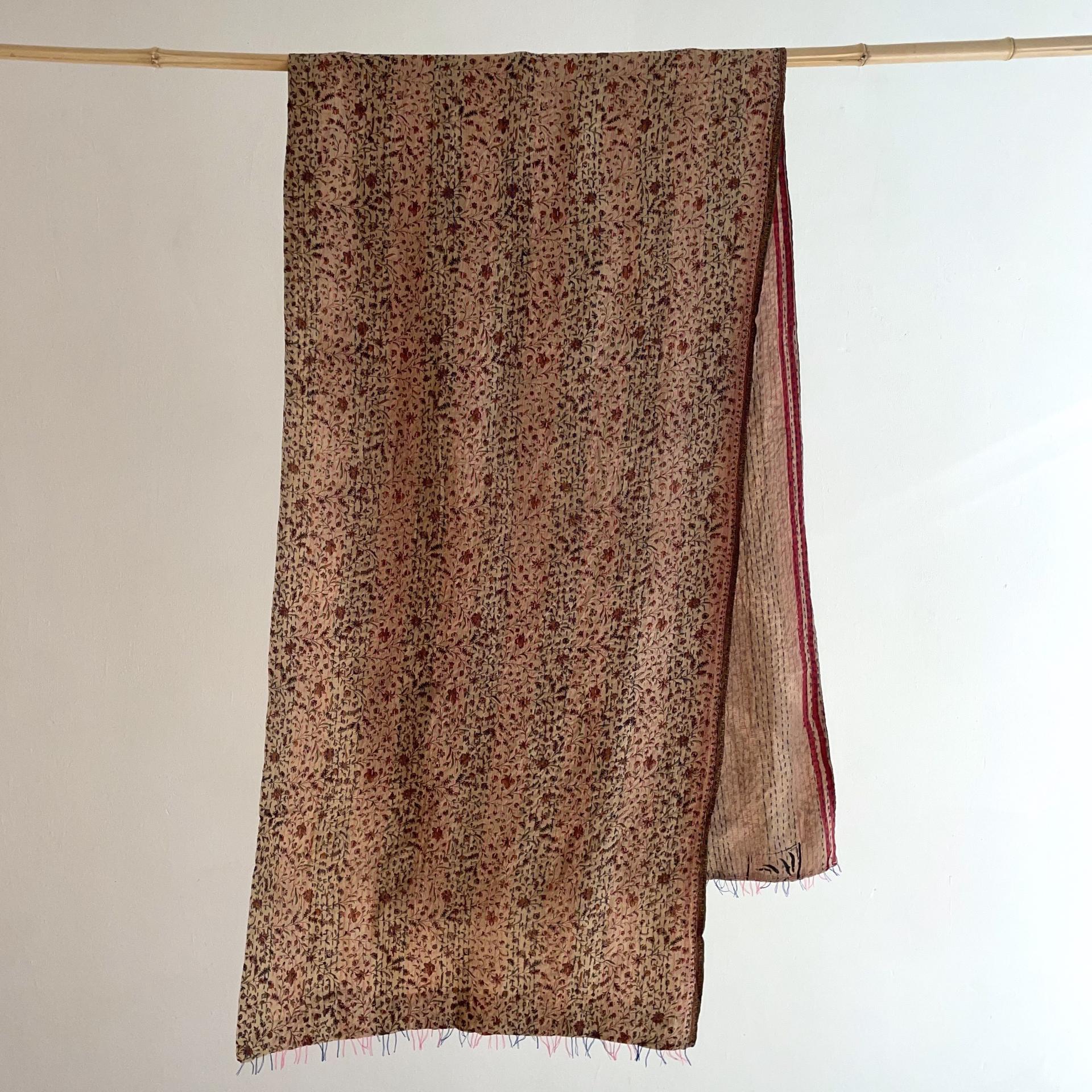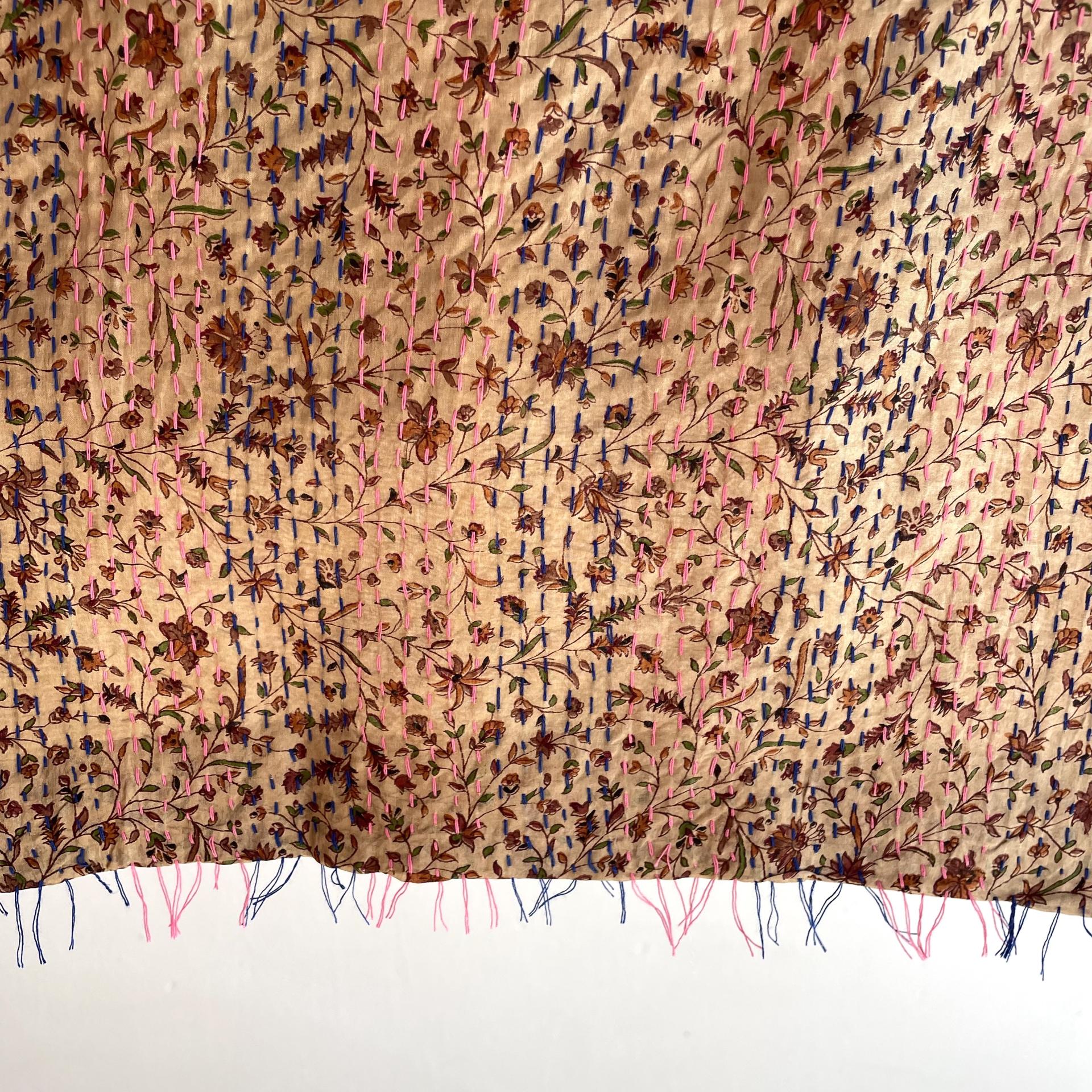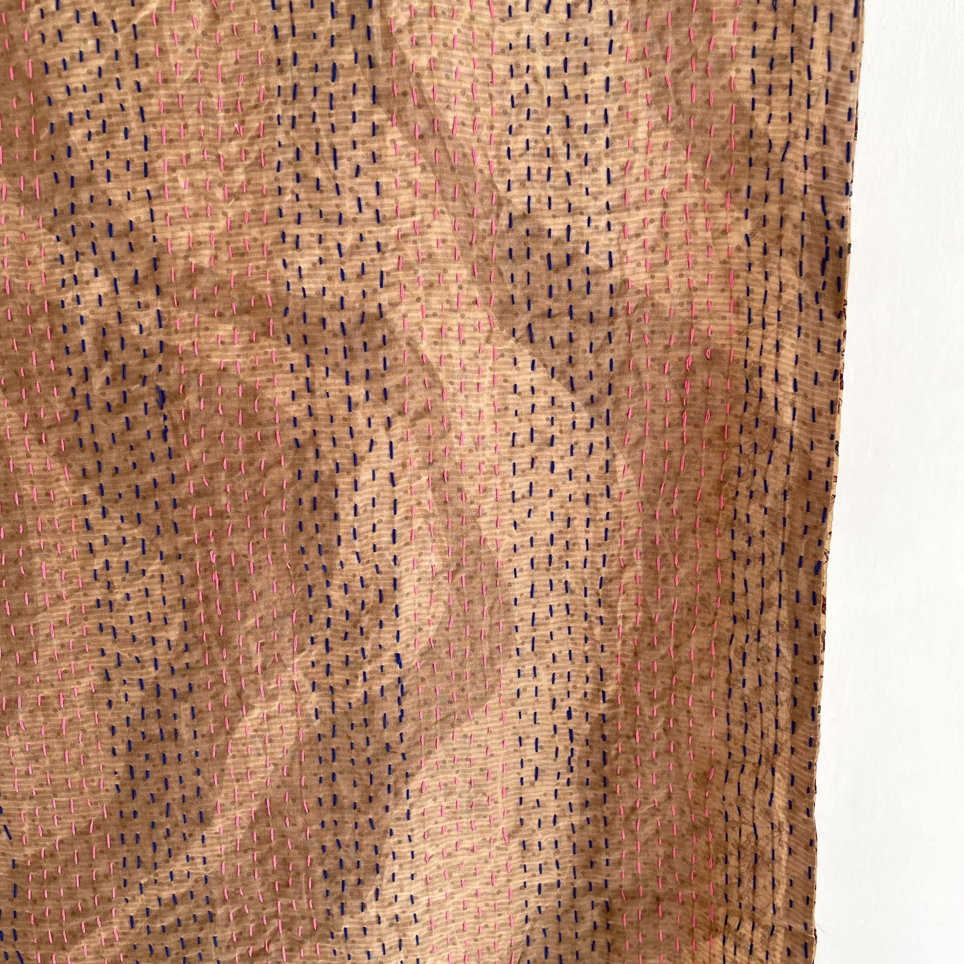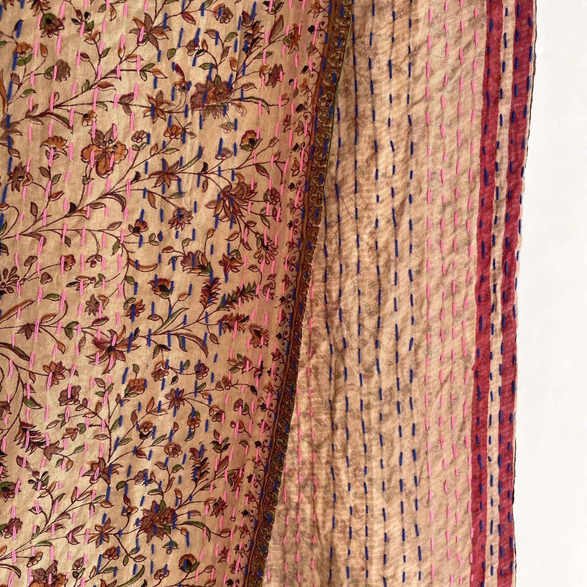 Kantha stitching in pink and blue on recycled silk Saris