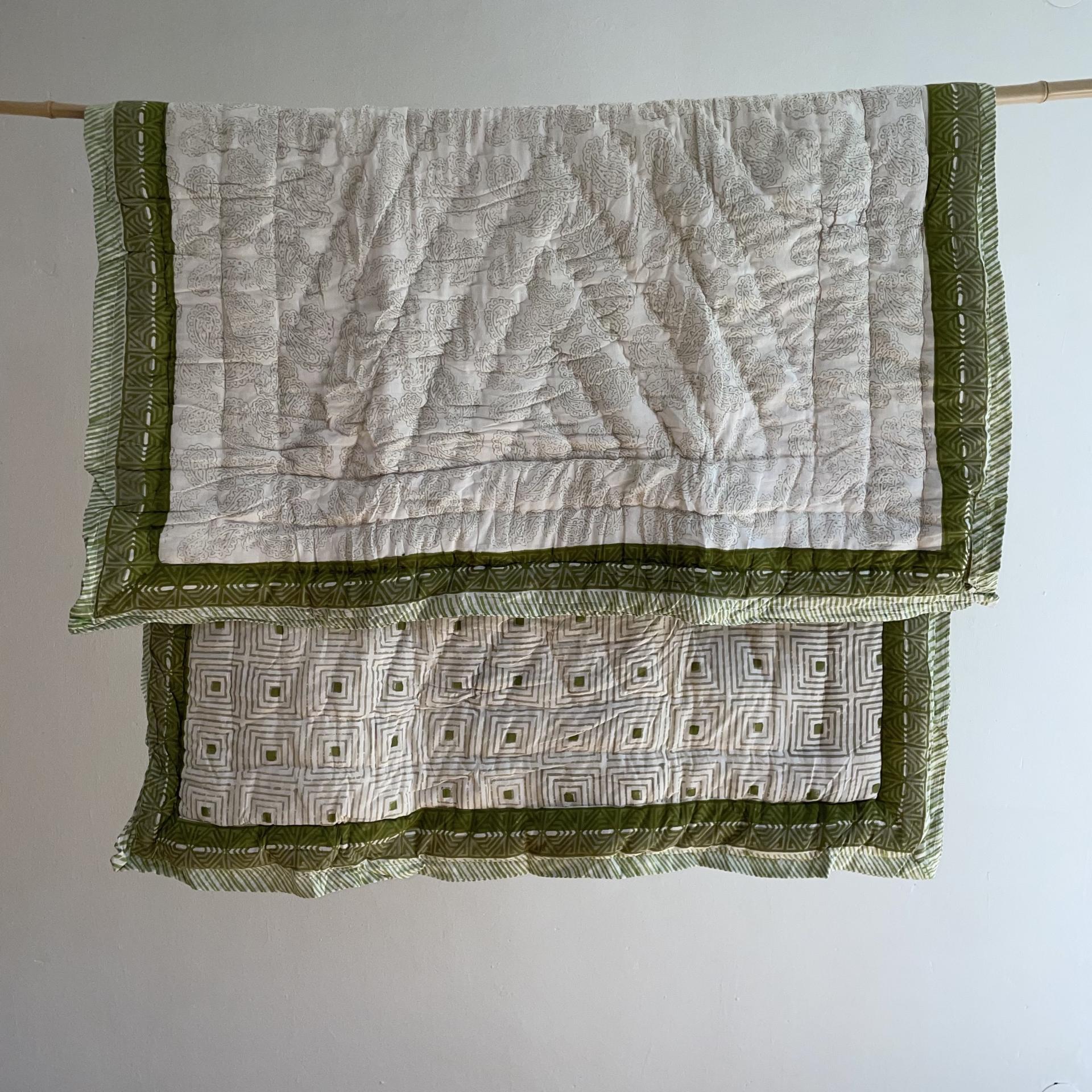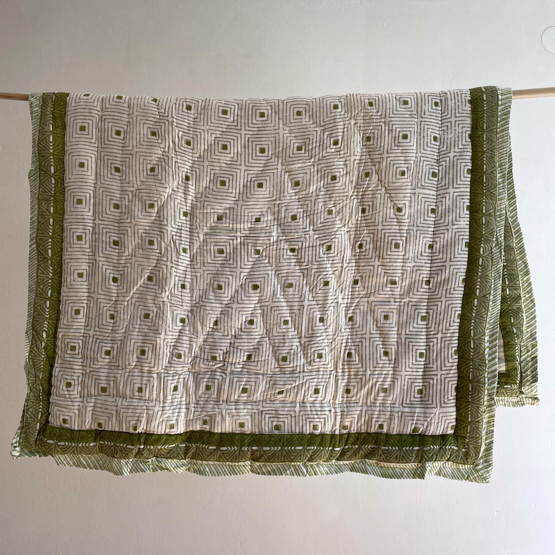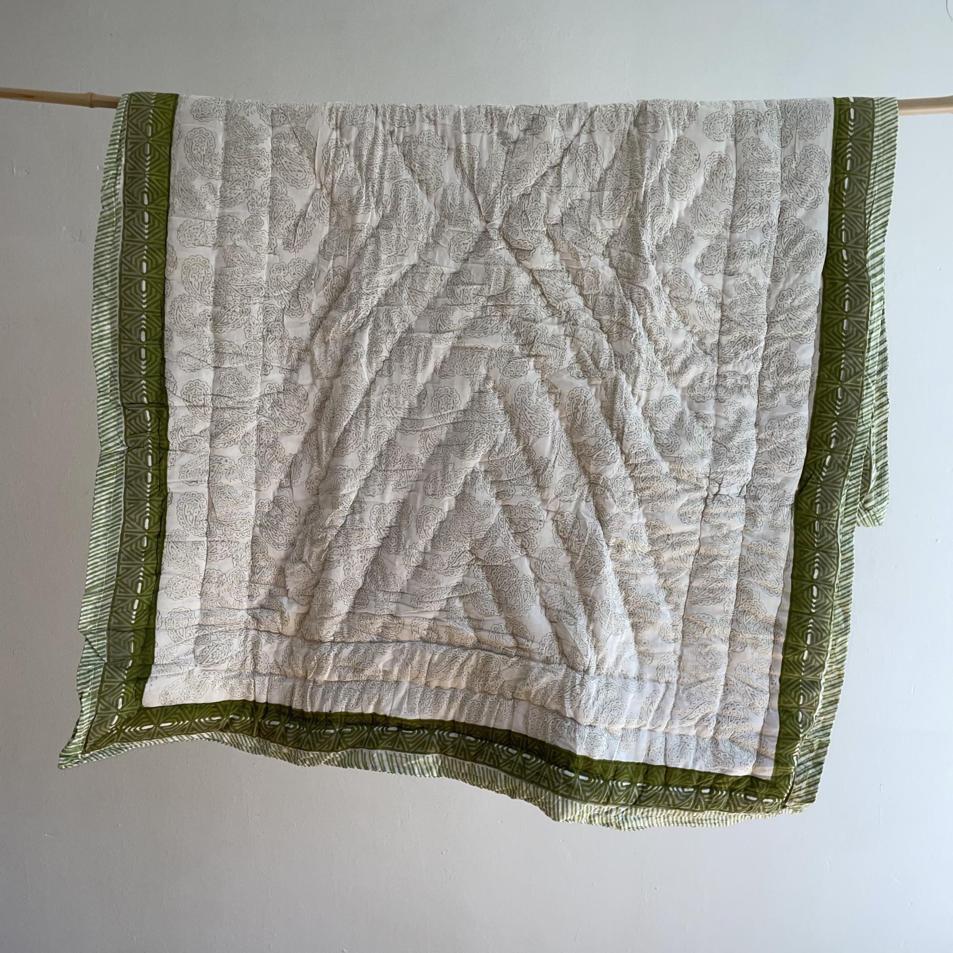 Woodblock Print Green, Smaller Quilted Cotton Blanket from India