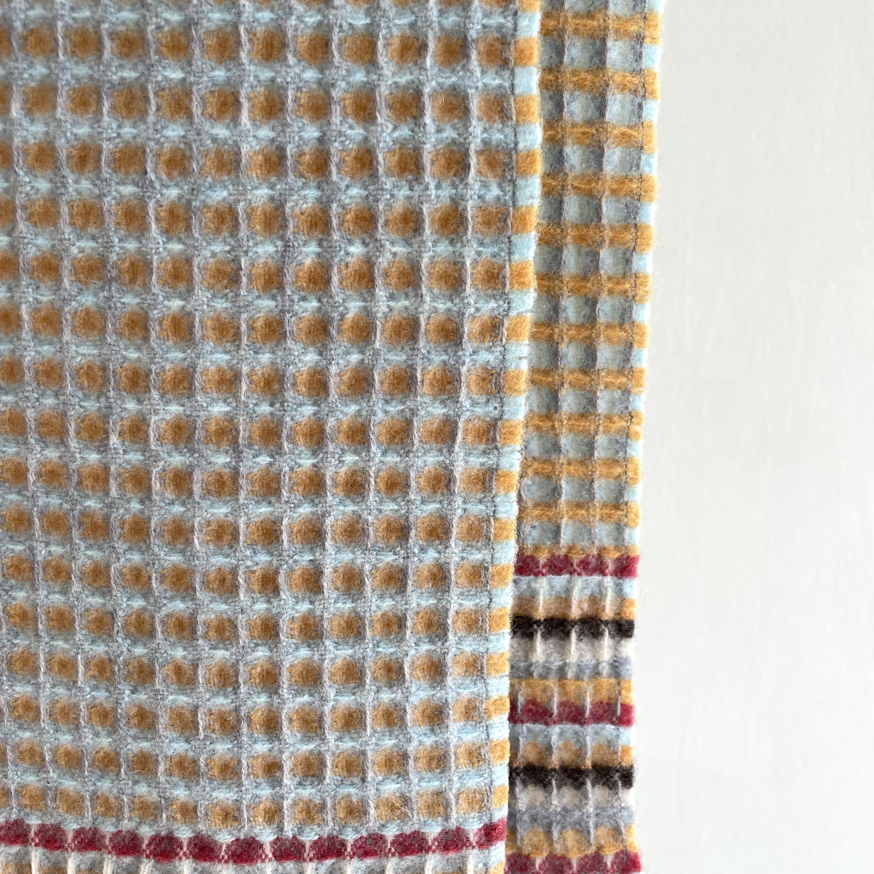 wonderful honeycomb weave in pinkish-orange, brownish dark grey, light grey, softest light blue, apricot